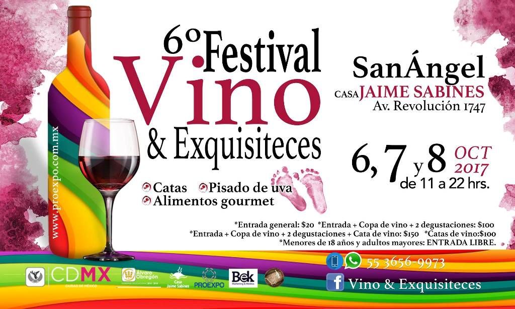Una fiesta para el paladar y para todos los sentidos que se llevará a cabo el viernes 6, sábado 7 y domingo 8 de Octubre de 11 a 20 Hrs., en Casa de Cultura ’Jaime Sabines’, ubicada en Av. Revolución No. 1747, Col. San Ángel, CDMX, con el fin de promover la cultura del vino y ofrecer a más de 40 expositores, la oportunidad de exponer y dar a degustar sus productos, impulsando la venta de los mismos.