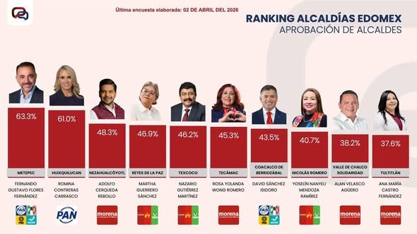 Mientras el gobierno municipal intenta posicionar encuestas ’a modo’ con cifras que poco reflejan la realidad que viven miles de familias, una nueva medición de la empresa Massive Caller pone las cosas en su lugar: la aprobación de la presidenta municipal Xóchitl Flores Jiménez se encuentra por los suelos, ubicándose en el lugar 14 de 19 alcaldes evaluados en el Estado de México, con apenas 32.6% de aprobación.