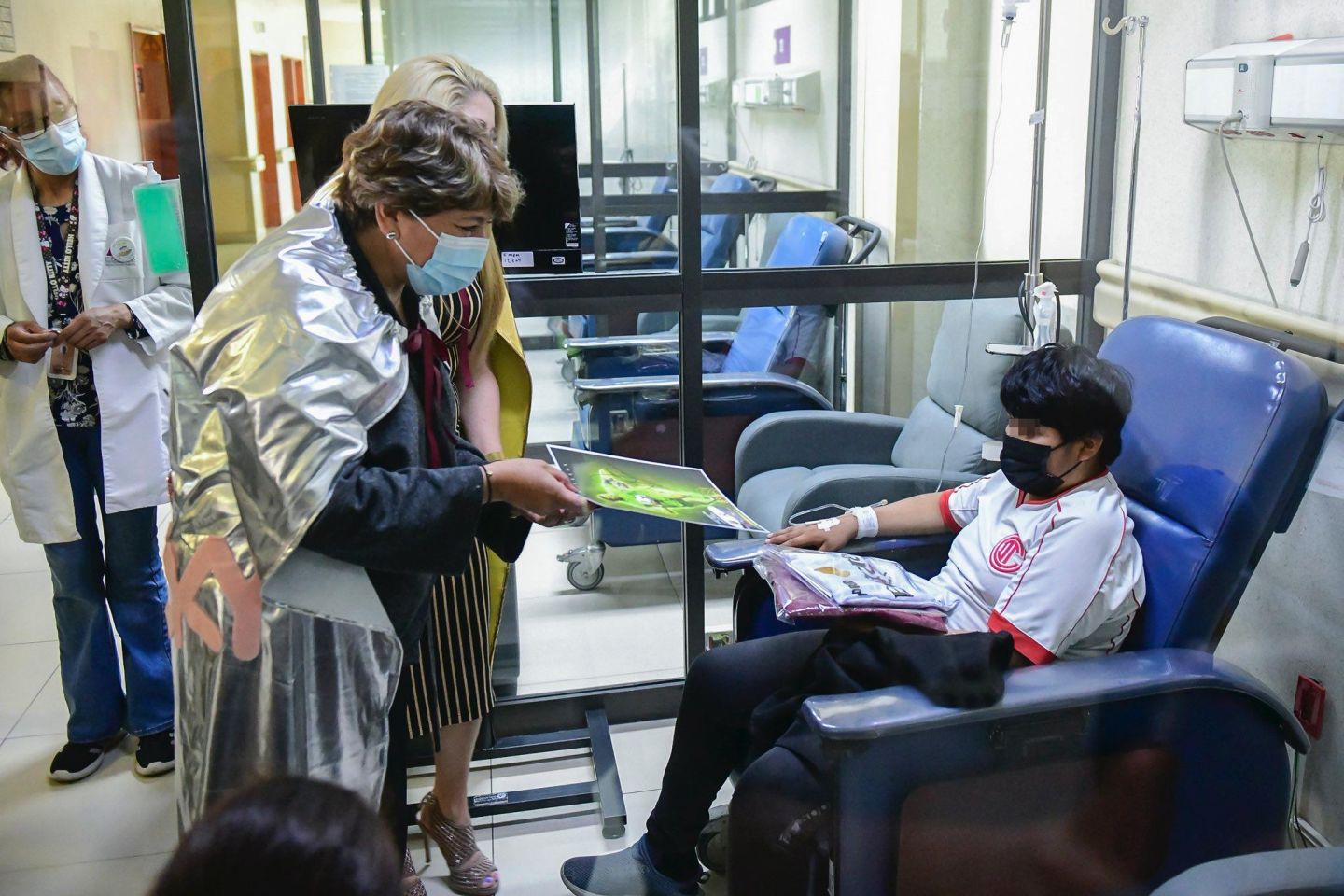 • Con motivo del Día del Niño y de la Niña, la Mandataria estatal visitó a los "valientes héroes" atendidos en las áreas de oncológica, quimioterapia consulta, nefrología, cirugía, infecto-escolares y medicina interna del Hospital para el Niño.