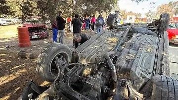 Tras el impacto, ambos automóviles terminaron volcados dentro de un predio utilizado como estacionamiento. El vehículo blanco quedó con las llantas hacia arriba y el toldo sobre el asfalto, mientras que el segundo automóvil presentó severos daños en la parte frontal.