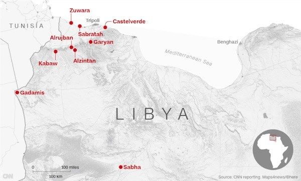 (PIE DE FOTO: Localizaciones de mercados de esclavos en Libia. @CNN)