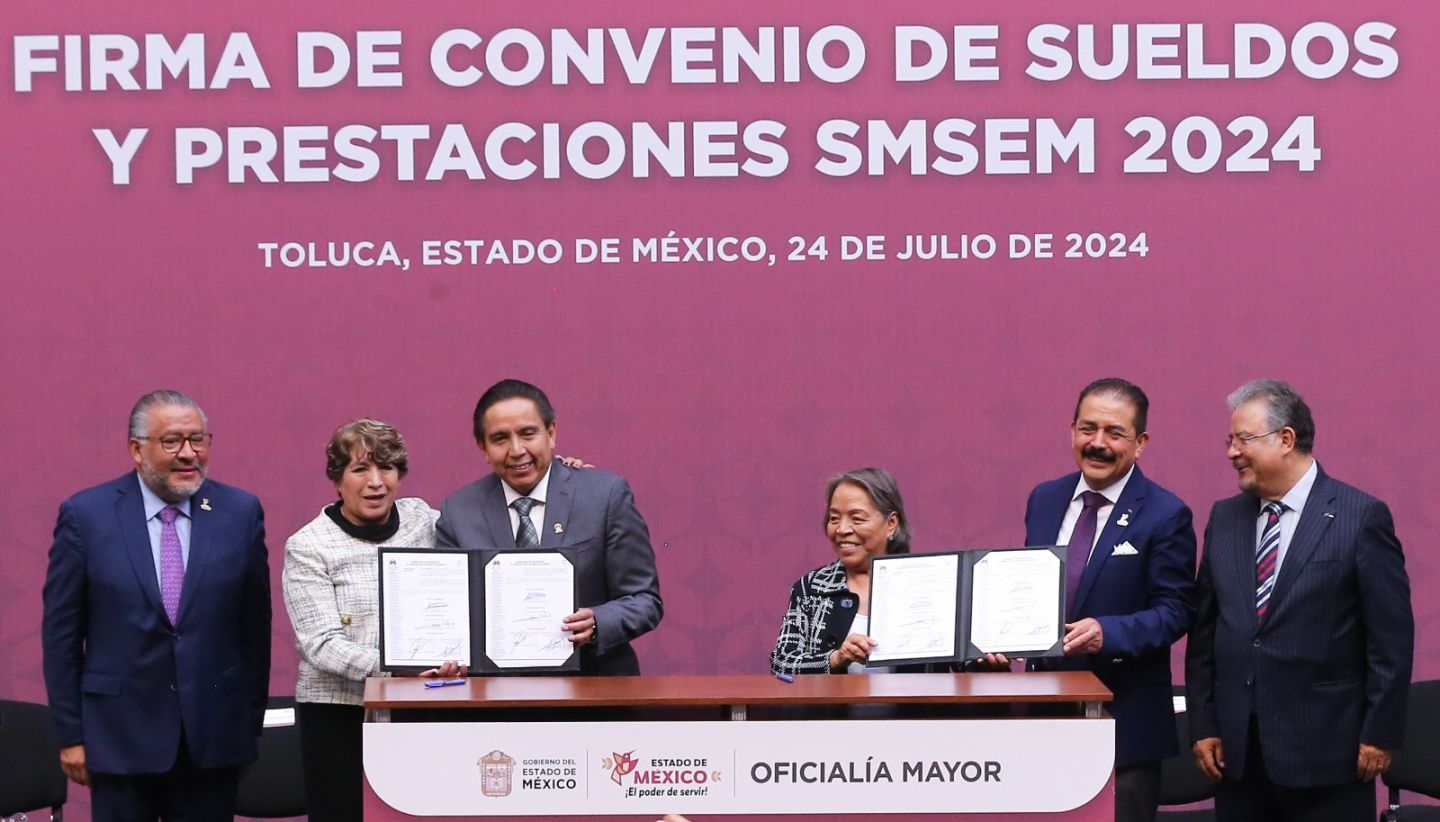 TOLUCA, Estado de México. – La Gobernadora Delfina Gómez Álvarez encabezó la Firma de Convenio de Sueldos y Prestaciones del Sindicato de Maestros al Servicio del Estado de México (SMSEM) 2024, con un incremento a la remuneración de los servidores públicos docentes, lo cual, no solo se verá reflejado en el sueldo base, sino en prestaciones como útiles escolares, gastos de transporte, material didáctico, despensa, entre otros.