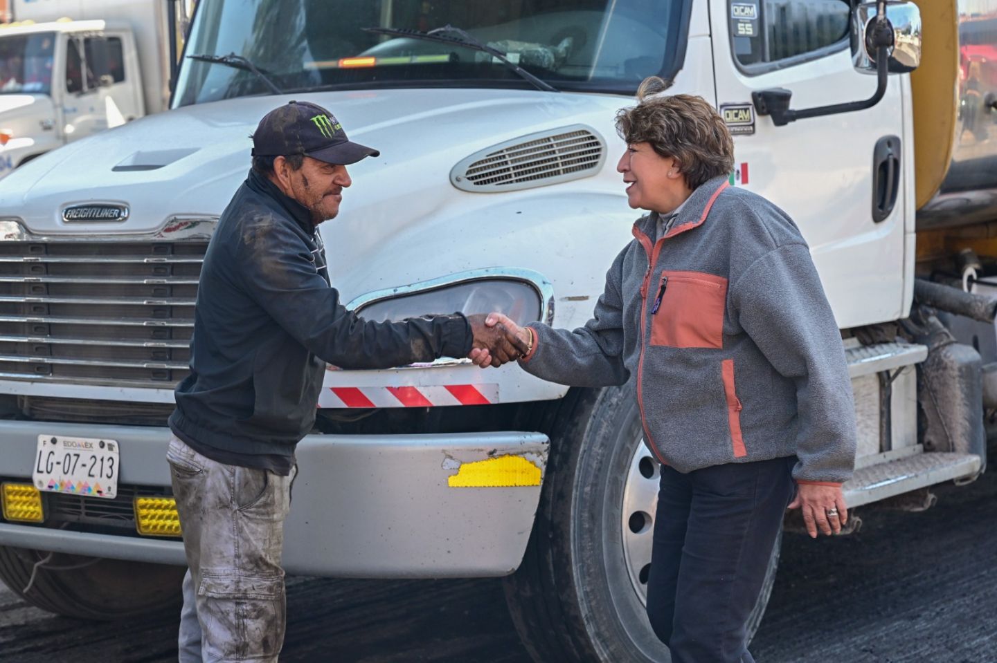 La Gobernadora aprovechó para saludar a las y los trabajadores encargados del fresado y tendido de carpeta asfáltica de 10 centímetros, quienes laboran diariamente para mejorar la movilidad de millones de mexiquenses y poder entregar esta magna obra.