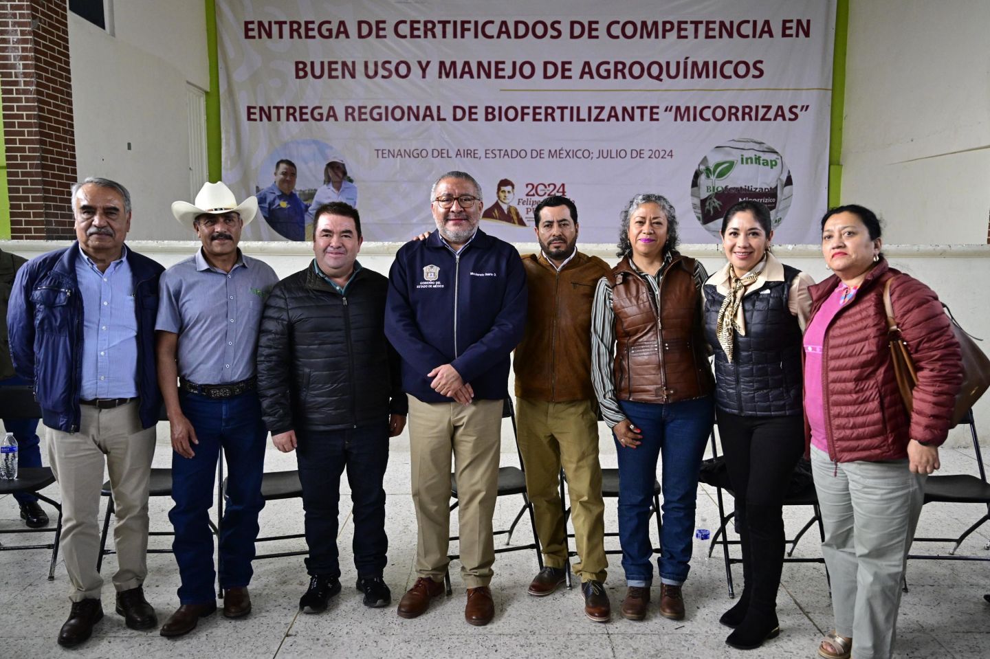 TENANGO DEL AIRE, Estado de México. - En un acto de justicia y reconocimiento a las y los campesinos mexiquenses, Horacio Duarte Olivares, Secretario General de Gobierno del Estado de México y María Eugenia Rojano Valdés, Secretaría del Campo asistieron a la entrega de biofertilizantes y certificados de buen uso y manejo de agroquímicos de la Secretaría de Agricultura y Desarrollo Rural federal, donde se informó que durante 2024 se han entregado 72 mil toneladas de fertilizante a productores del campo mexiquense.