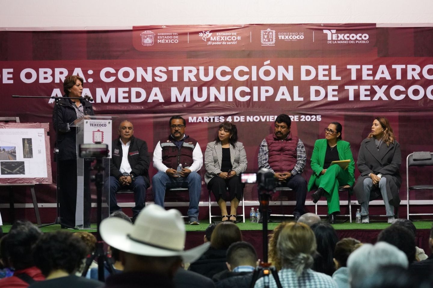 La Gobernadora del Estado de México Delfina Gómez Alvarez, junto con el presidente municipal Nazario Gutiérrez Martínez realizaron el inicio de la obra del Teatro al Aire Libre en la Alameda Municipal de Texcoco, en donde se destacó este municipio como único en el Estado de México que está realizando el embellecimiento de las fachadas rescatando la tradición texcocana.