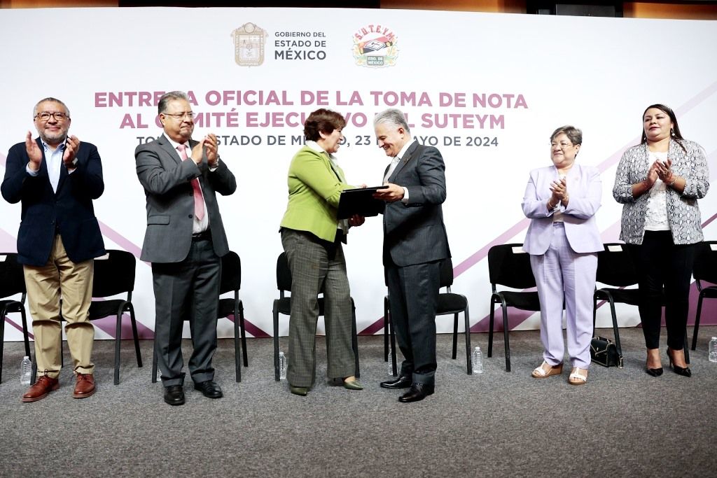 TOLUCA, Estado de México.- La Gobernadora del Estado de México, Delfina Gómez Álvarez entregó la Toma de Nota al Comité Ejecutivo del Sindicato Único de Trabajadores de los Poderes, Municipios e Instituciones Descentralizadas del Estado de México (SUTEYM), en la que reconoció su contribución al pueblo mexiquense a través del servicio púbico y su compromiso con la justicia laboral.