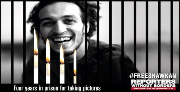 Shawkan fue detenido con su cámara en la mano el 14 de agosto de 2013, mientras cubría la violenta dispersión de una manifestación en la plaza Rabaa al Adawiya, por parte de la policía, tras el derrocamiento del entonces presidente Mohamed Morsi. En una de las interminables sesiones el juez preguntó por su profesión y por qué estaba allí en el momento de la dispersión de la manifestación a lo que contestó, ’estaba cubriendo lo ocurrido, había otros periodistas que fueron liberados’.