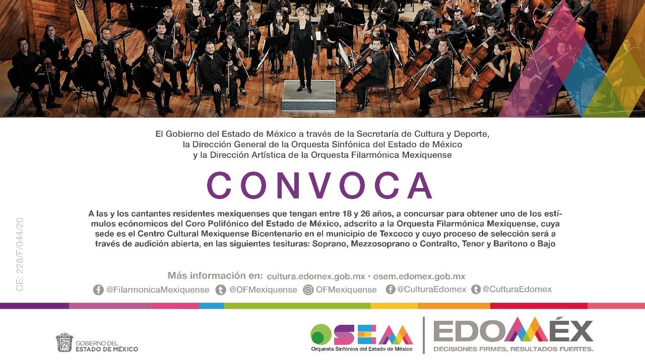 La segunda convocatoria va dirigida a las y los cantantes mexicanos mayores de edad, que quieran concursar para obtener uno de los estímulos económicos del Coro Polifónico del Estado de México, cuya sede es Toluca.