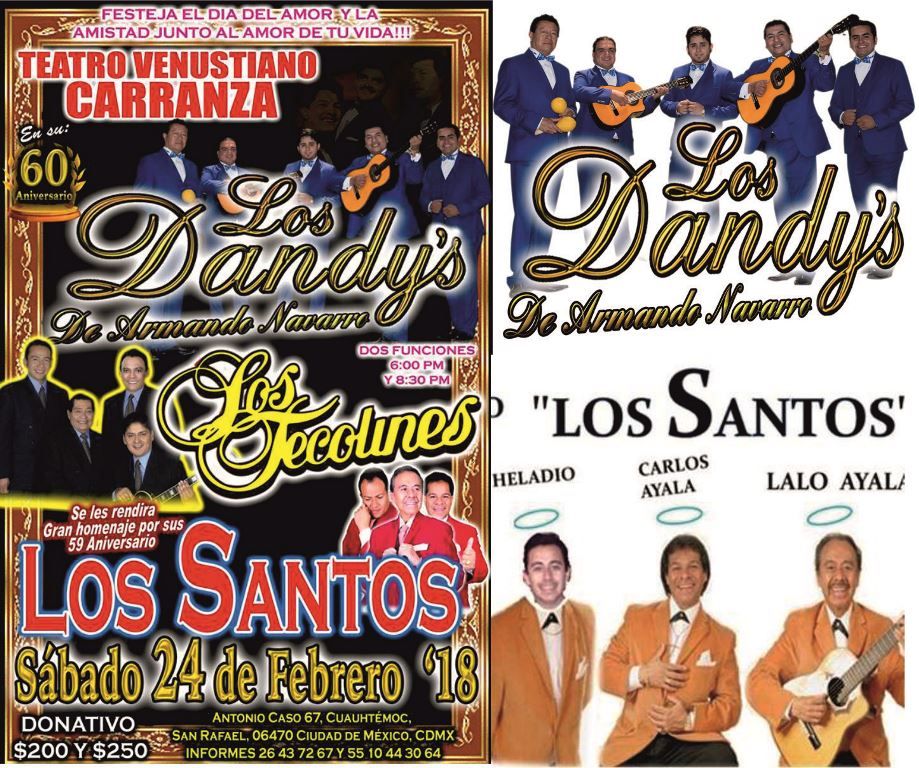 Con dos funciones que se llevarán a cabo el mismo día, el reconocido trío Los Santos serán homenajeados el próximo sábado 24 de Febrero en el Teatro Venustiano Carranza, ubicado en Antonio Caso No. 67, esquina con Insurgentes en la Colonia San Rafael por dos agrupaciones no menos legendarias como son Los Dandys y Los Tecolines, en un afán de seguir trabajando con la música popular que ha marcado la historia cultural de México. Ambas funciones se llevarán a cabo el mismo día con dos horarios disponible a las seis de la tarde y ocho y media de la noche, los boletos se encuentran a la venta en taquillas del inmueble y el día del evento a un costo de $200.00 y $250.00.