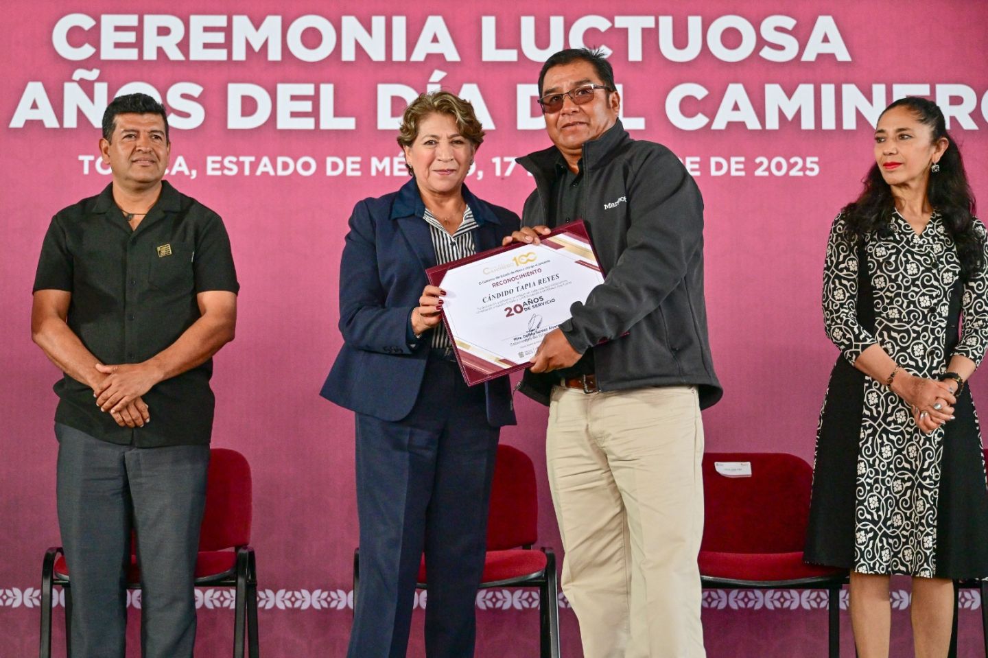 Durante esta celebración, en la que se rindió tributo a un siglo de dedicación a la infraestructura vial, la mandataria estatal relevó la placa conmemorativa ’Centenario del Día del Caminero’ y entregó reconocimientos a trabajadores de la Junta de Caminos del Estado de México por hasta 45 años de servicio. También se guardó un minuto de silencio por los camineros caídos este año en el cumplimiento de su deber.