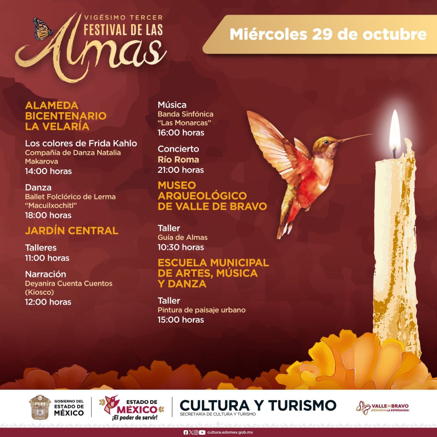 VALLE DE BRAVO, Estado de México.– Con gran entusiasmo se vivió el tercer día del Festival de las Almas 2025, que ha llenado de arte, música y tradición las calles de Valle de Bravo. El Gobierno del Estado de México, a través de la Secretaría de Cultura y Turismo, ofreció actividades culturales, entre conciertos y talleres.