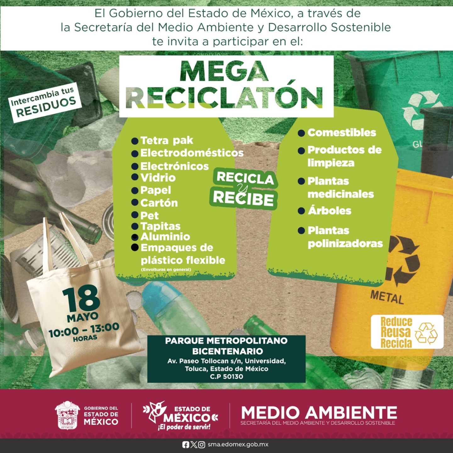 *METEPEC,* Estado de México.- Con el objetivo de fomentar la economía circular al reducir la generación de residuos en el Estado de México, el Gobierno de la Maestra Delfina Gómez Álvarez invita a la población a participar en el Mega Reciclatón este domingo 18 de mayo de 10:00 a 13:00 horas en el Parque Metropolitano Bicentenario de Toluca.