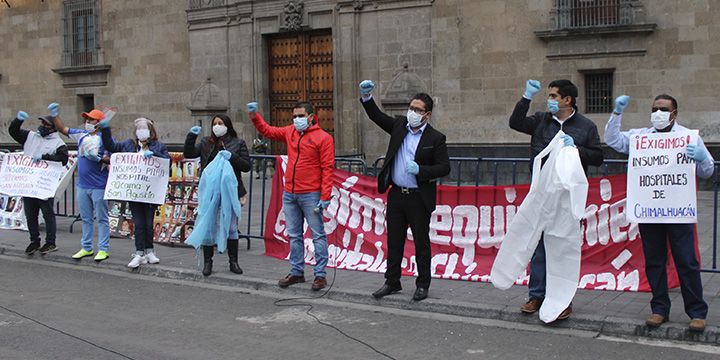’Continuaremos solicitando la intervención del gobierno federal hasta encontrar una respuesta favorable a la demanda de insumos de calidad para los hospitales 90 camas y San Agustín, debido a que el personal médico enfrenta una crisis de material y están en riesgo de contraer COVID-19’, declaró el secretario del Ayuntamiento de Chimalhuacán, Saúl Torres Bautista, durante la movilización realizada en Palacio Nacional.