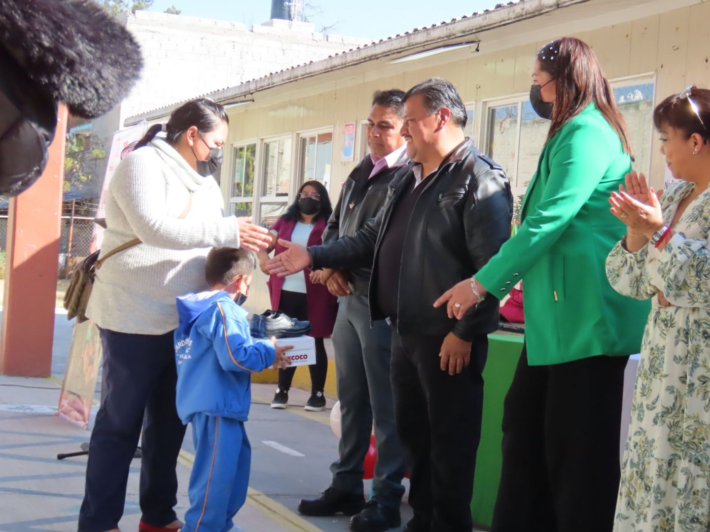’El hecho de que un niño tenga zapatitos nuevos le genera confianza y alegria’, dijo la directora del Preescolar Xochiquetzal al dirigirse a las autoridades.